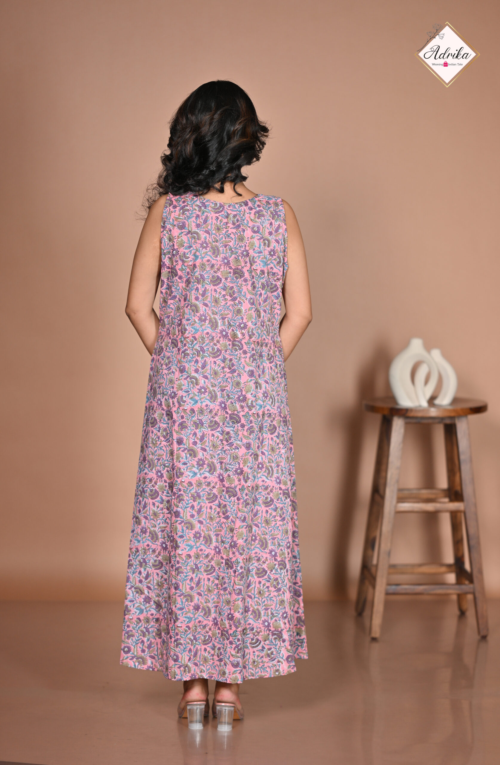 Adrika’s Pink Cotton Hand block Long Dress