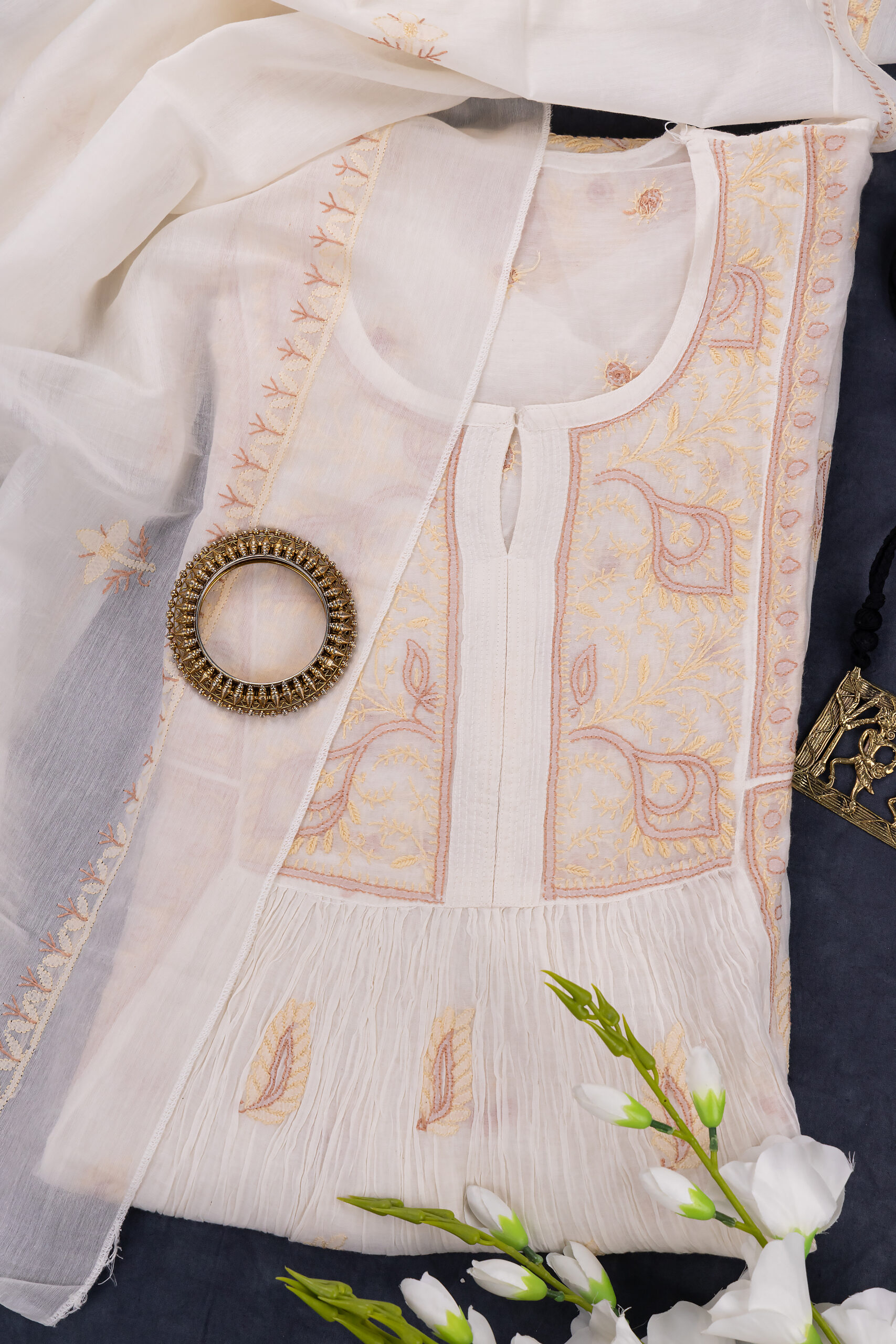 This off white Chanderi cotton Lucknow Chikankari semi-stitched 2 pc kurti set