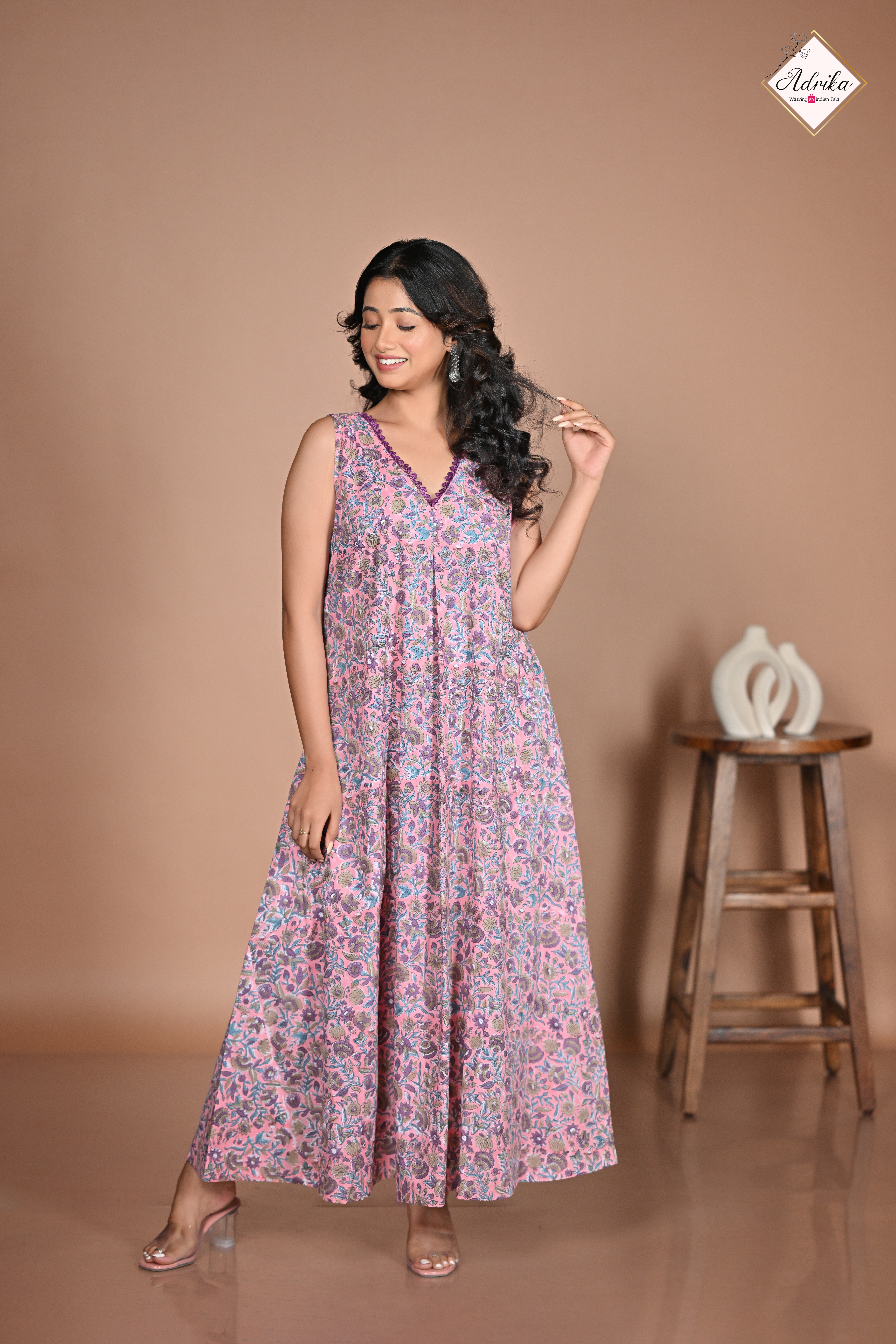 Adrika’s Pastel Purple Cotton Hand-Block Long Dress