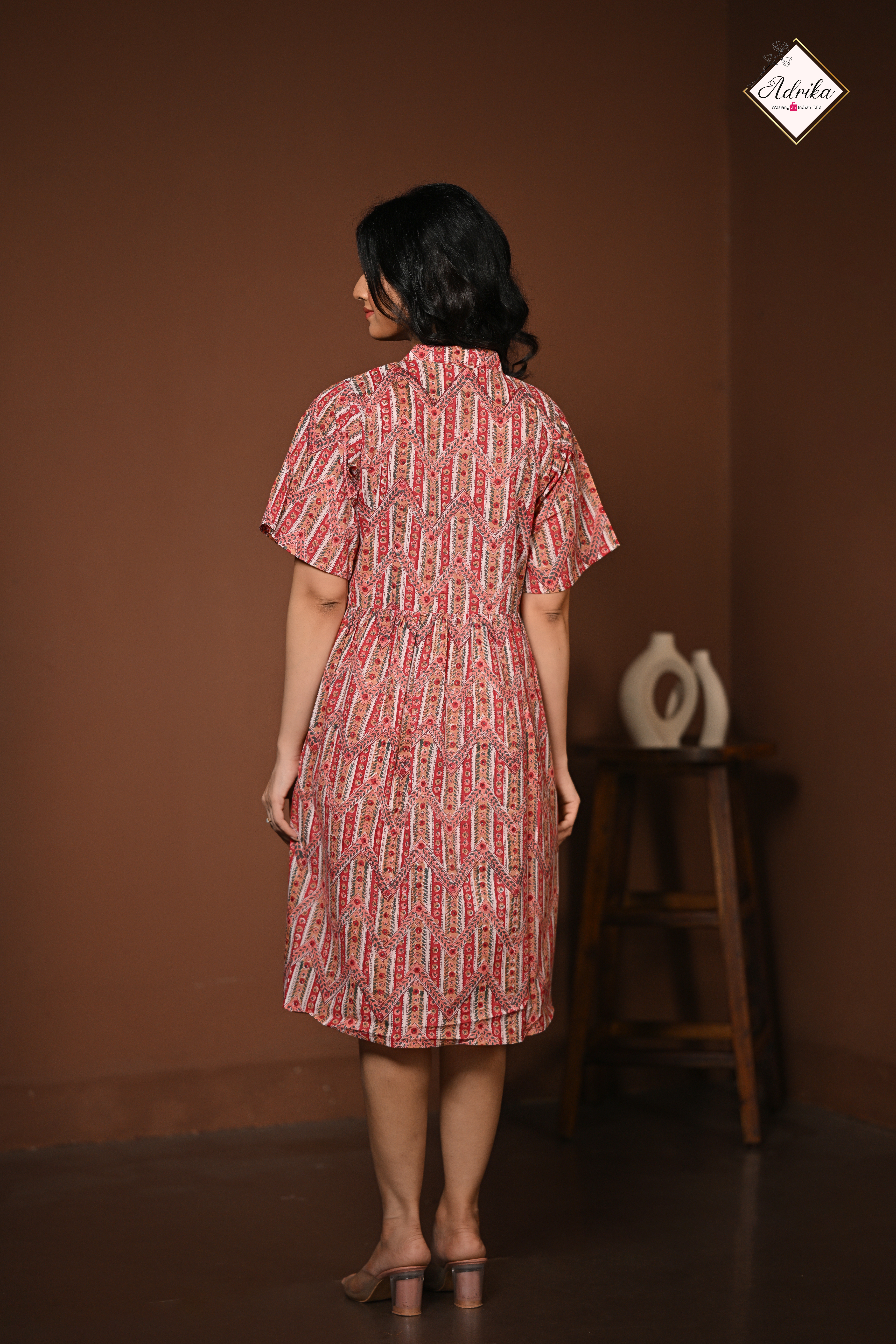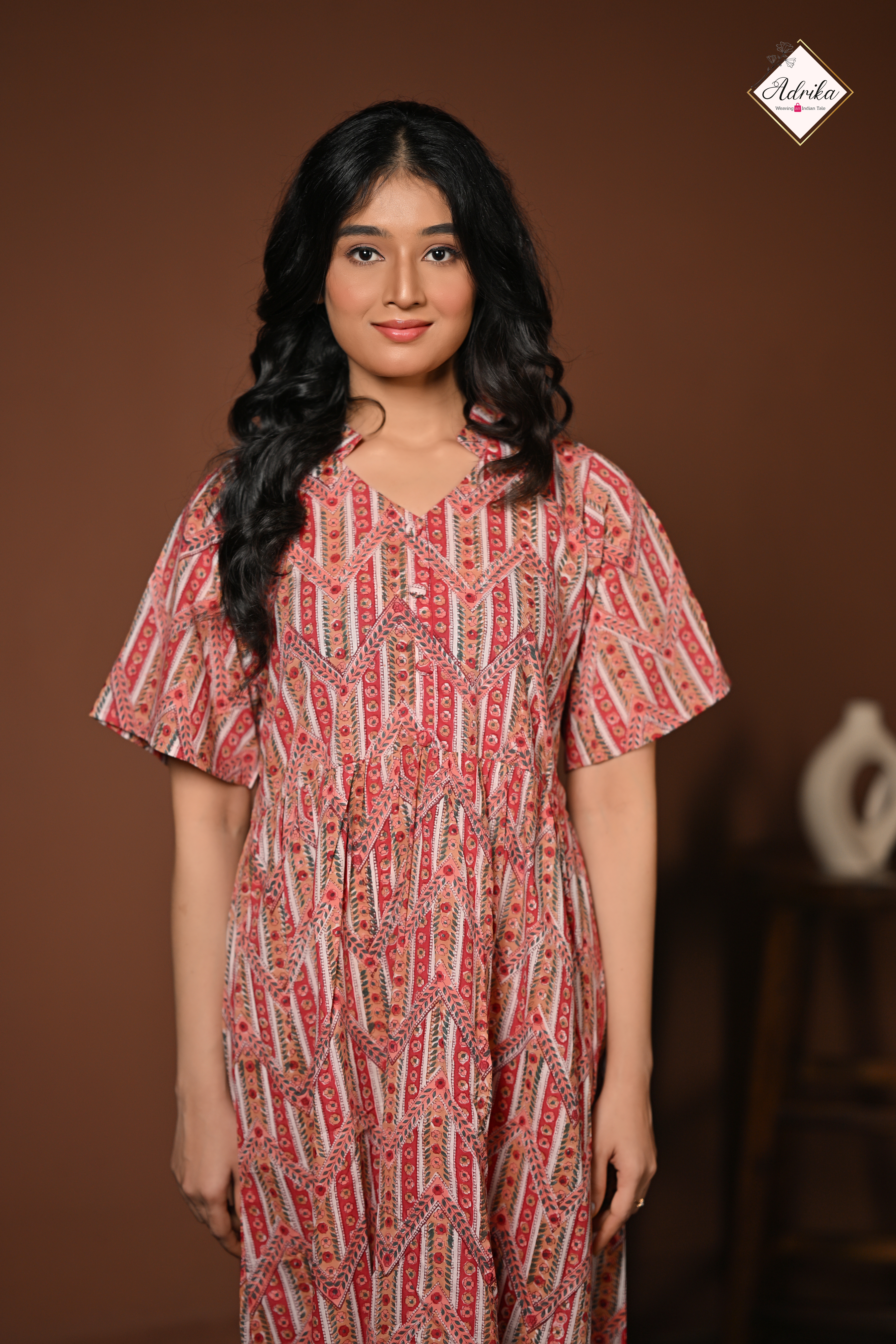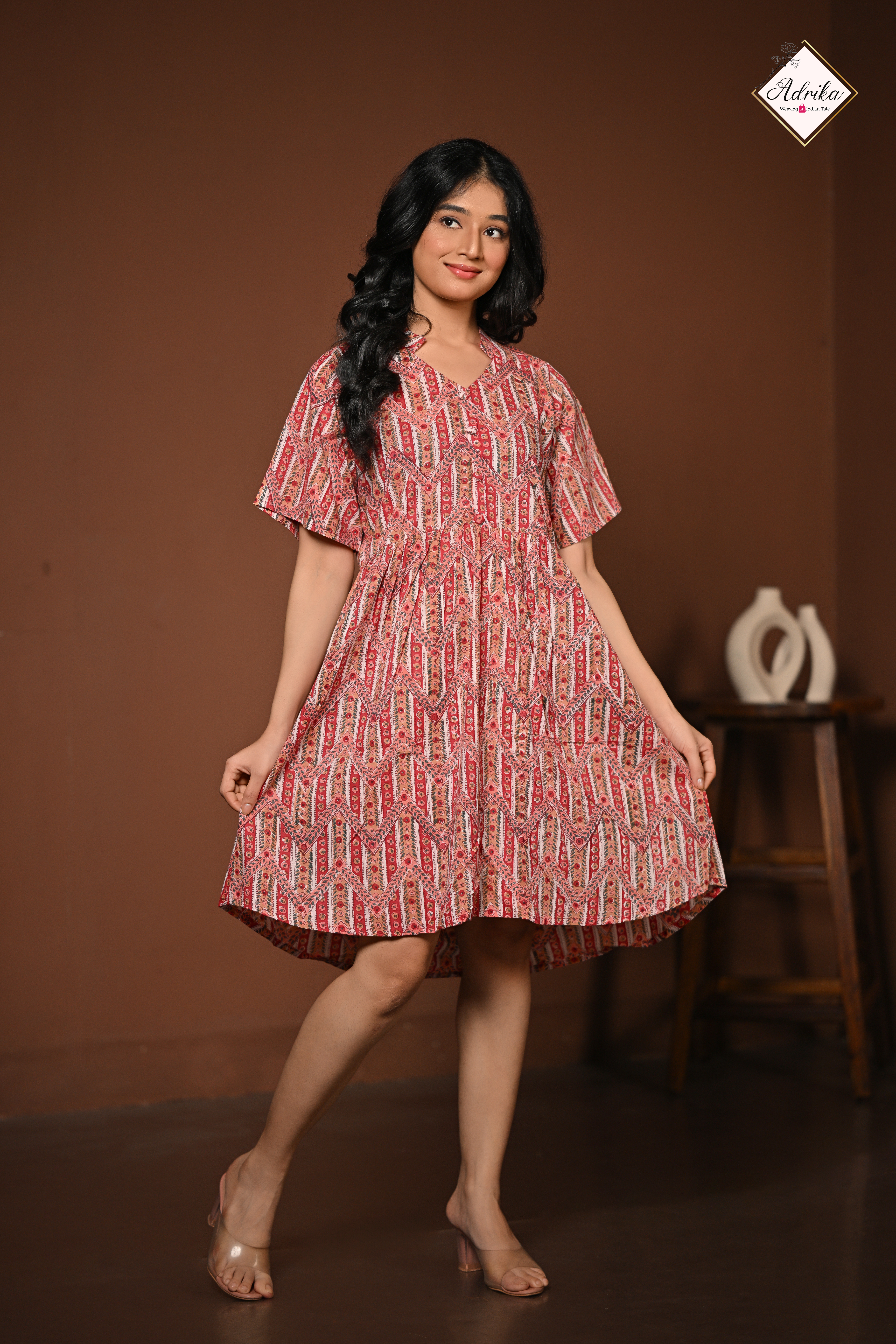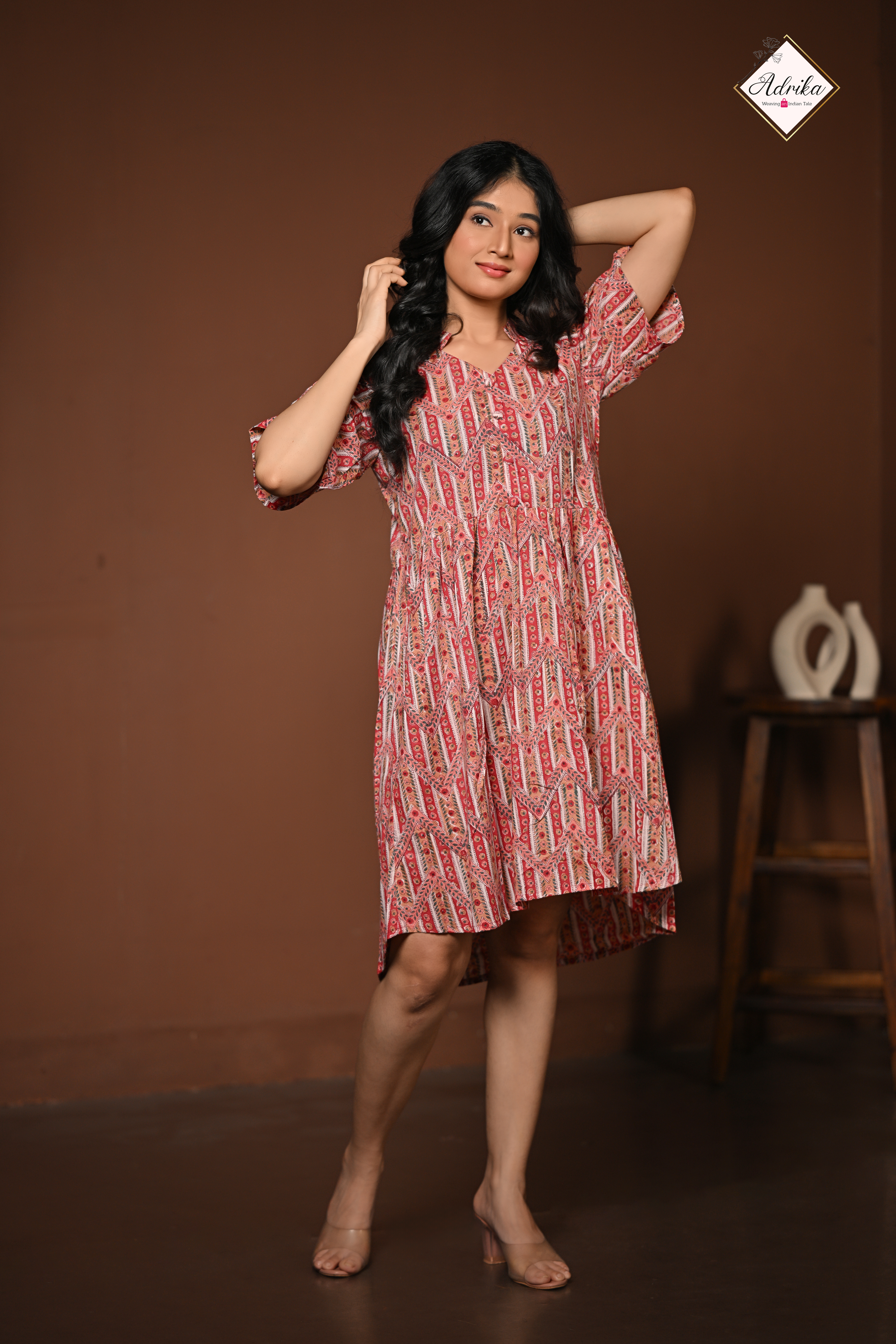 This multi color hand-block cotton dress offers a comfortable & relaxed silhouette to the wearer, the fabric is skin friendly.